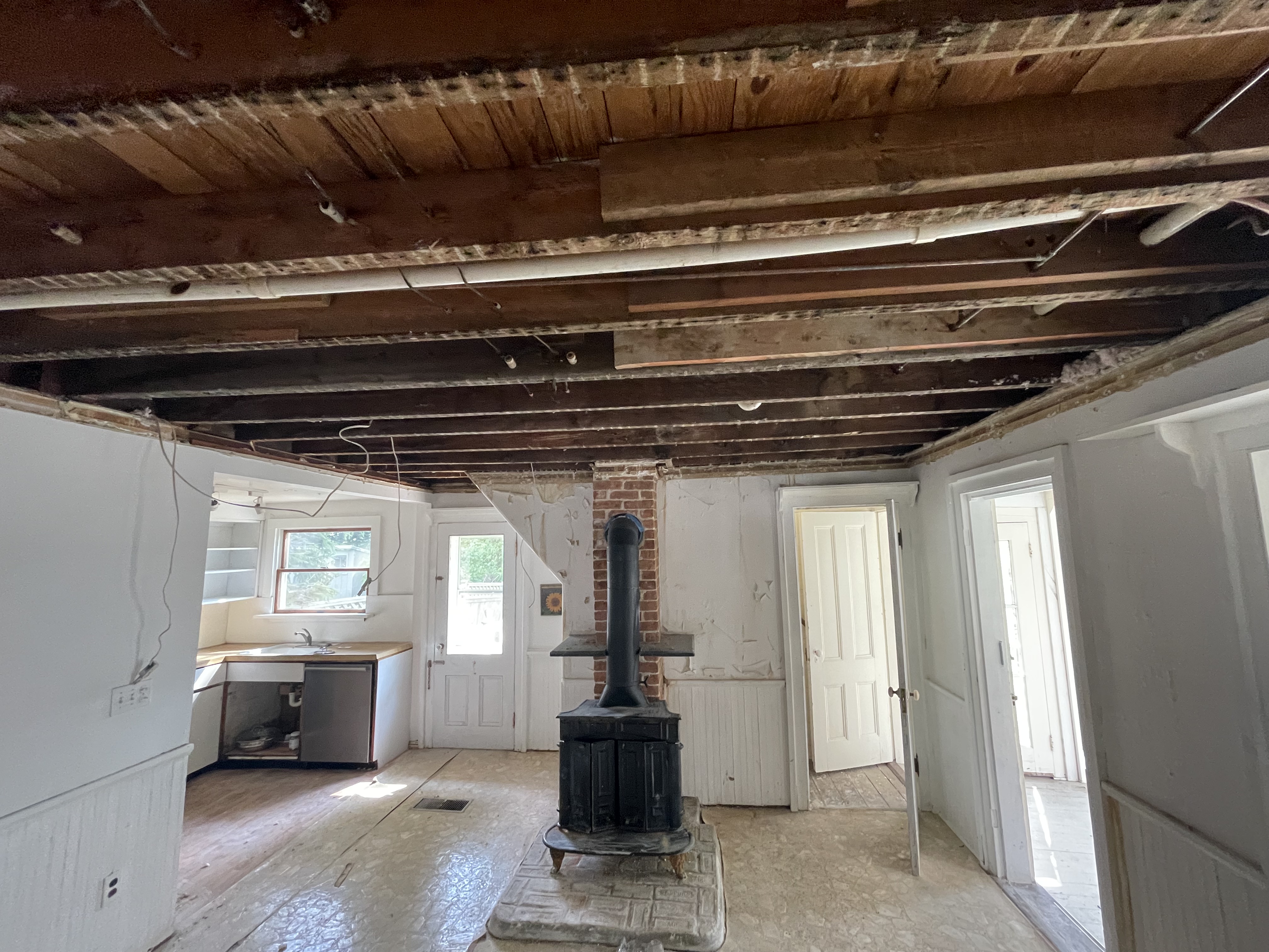 Kitchen showing water damage. The new wood stove will be smaller, have a glass front, and in the living room.