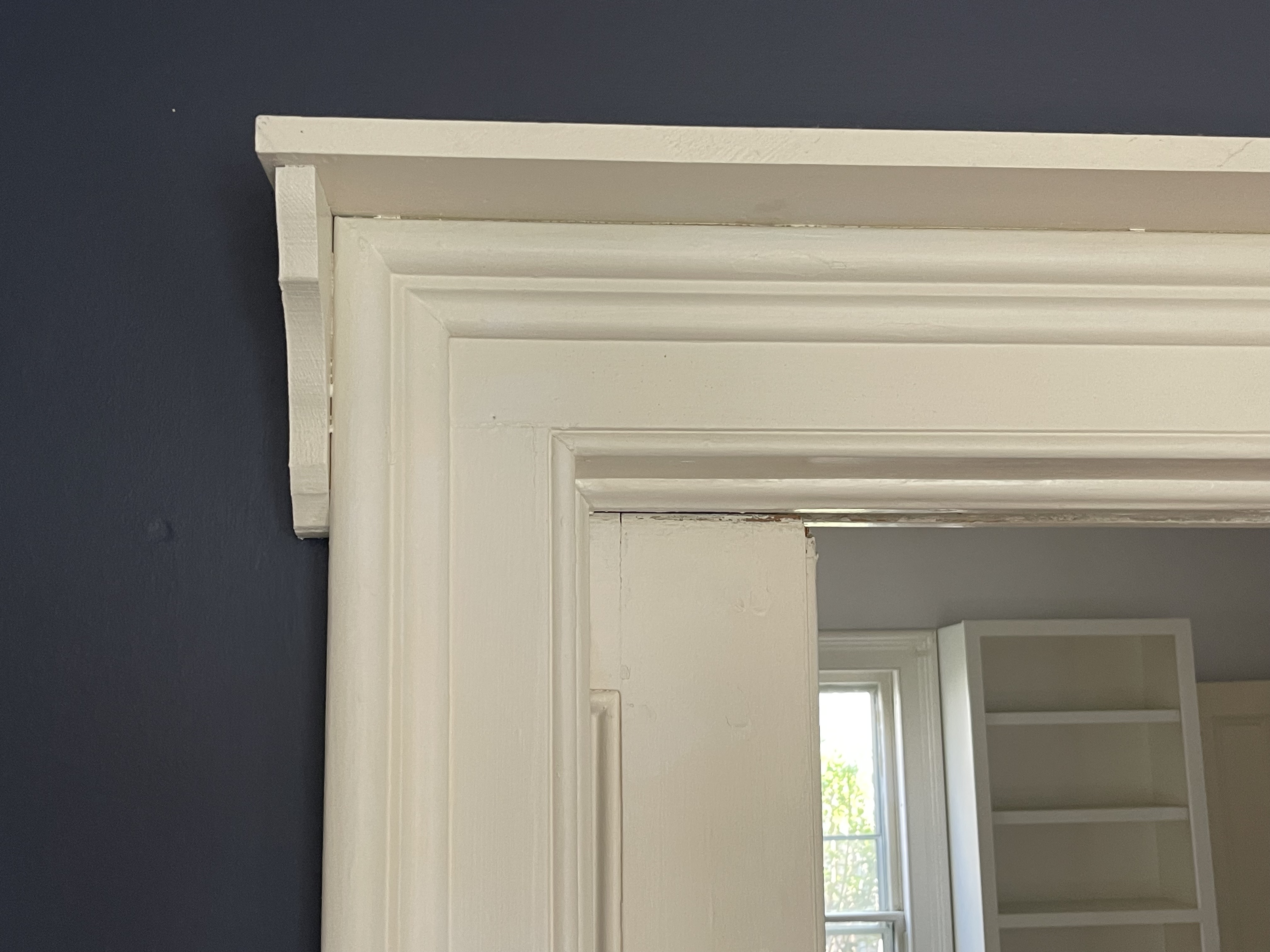 Dining room casing. The casing sticks out enough that someone mounted ledges above the doors.