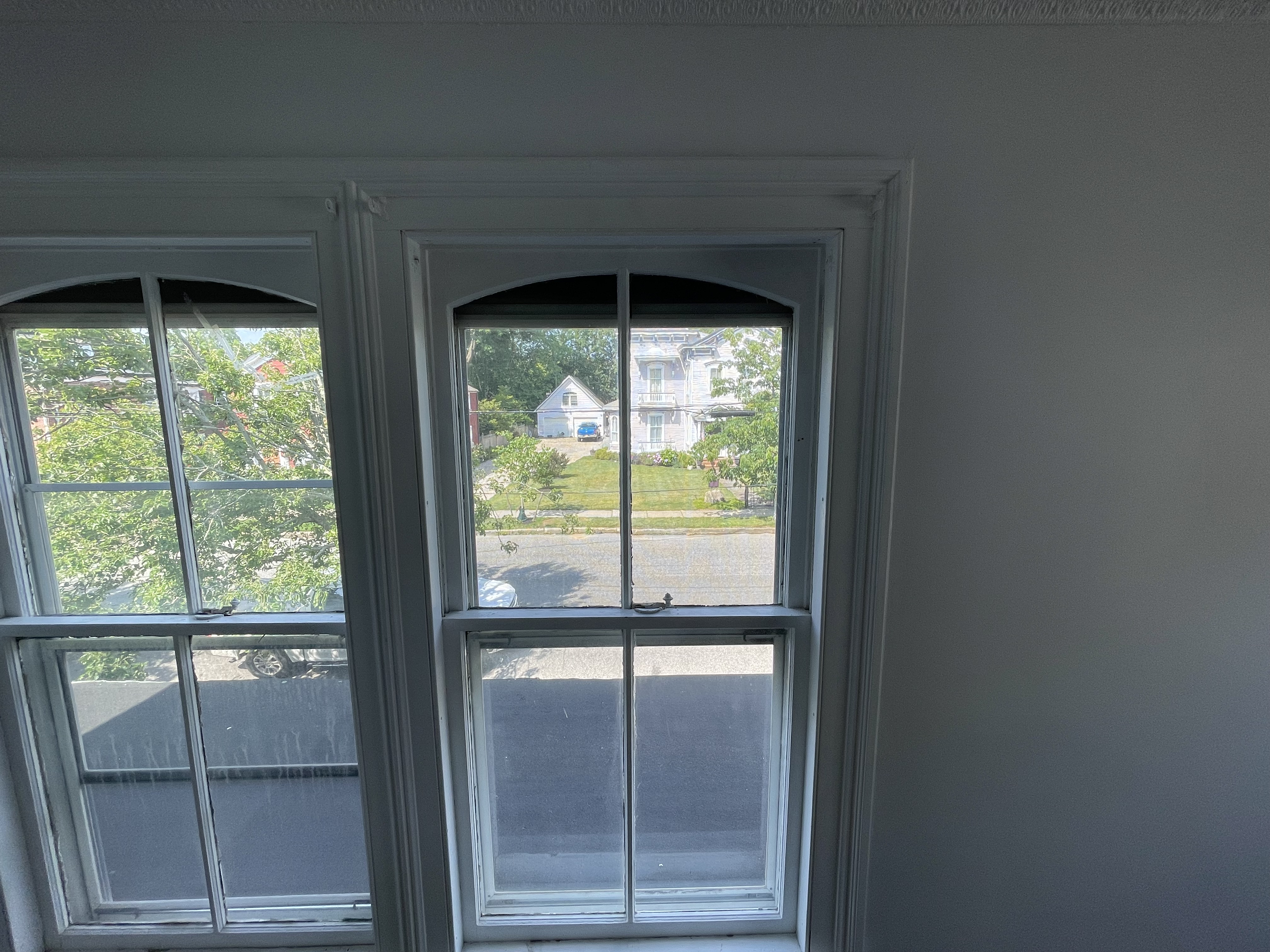 Office/family room. The arch top windows were restored and the storm windows removed.