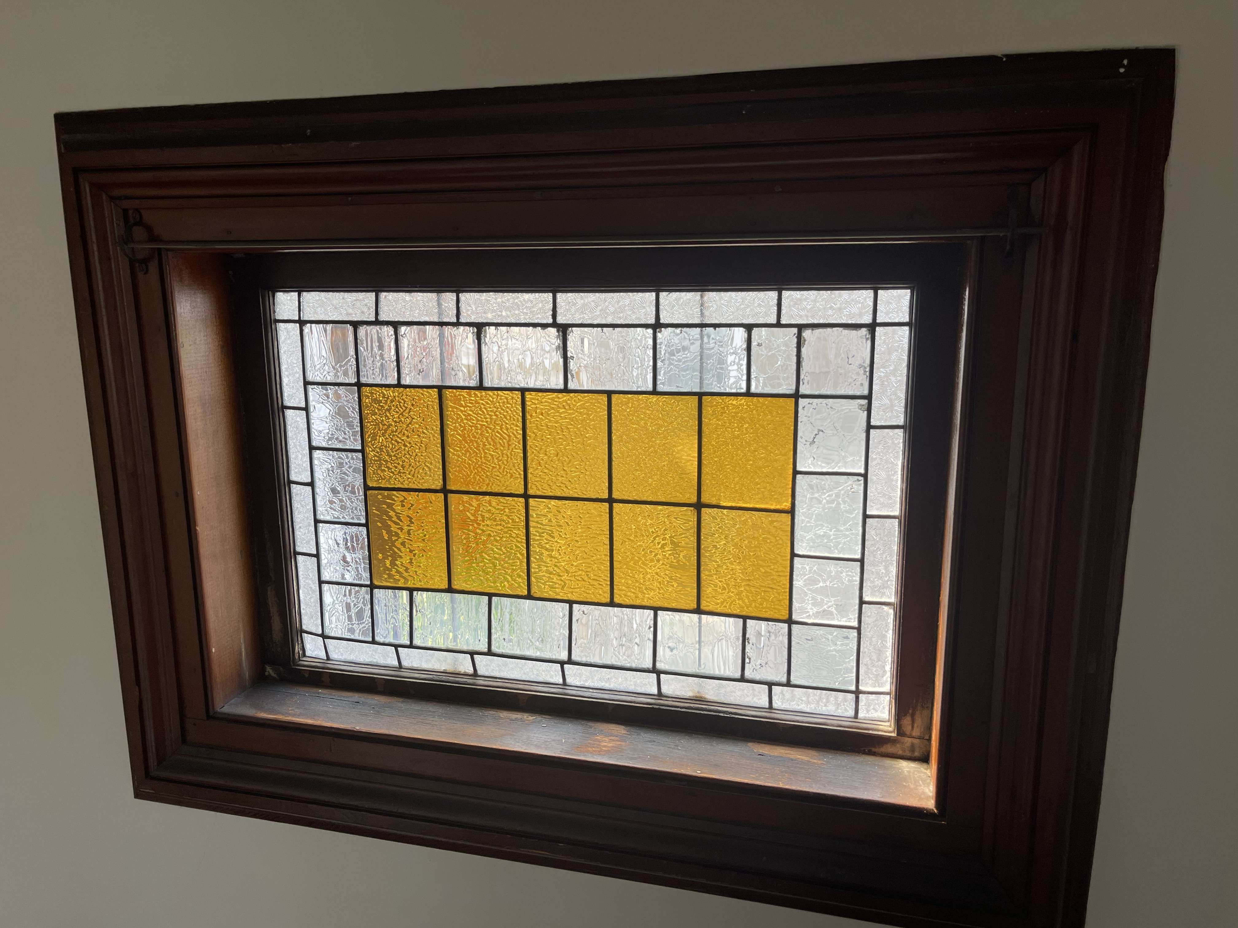 Stained glass window in stairway. Three types of glass: hammered, crackle and mayflower. Support bars are on the outside. Unusual. Needs to be flattened.