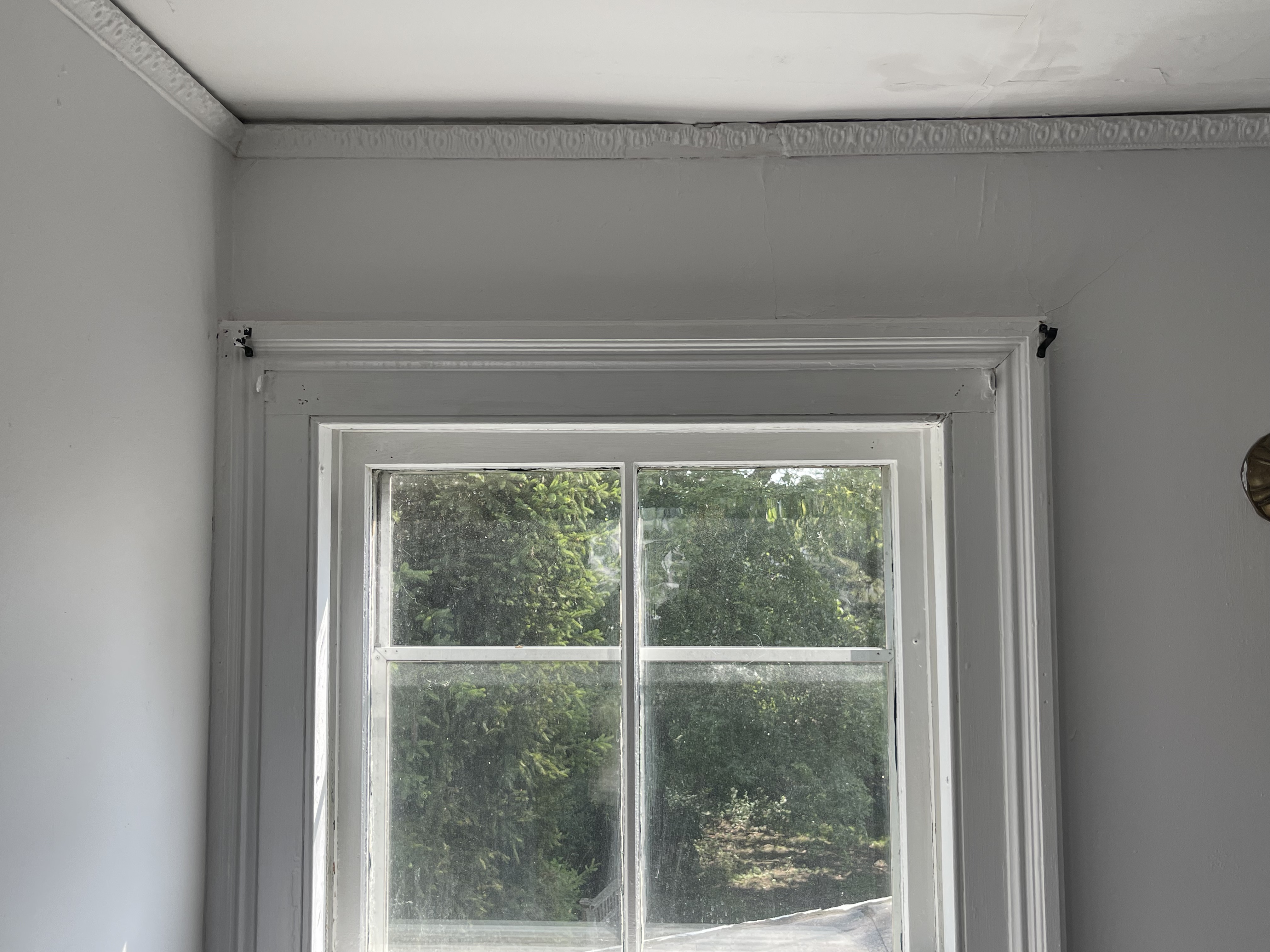 Window casing in primary bedroom facing the back. Window has been reduced in width.