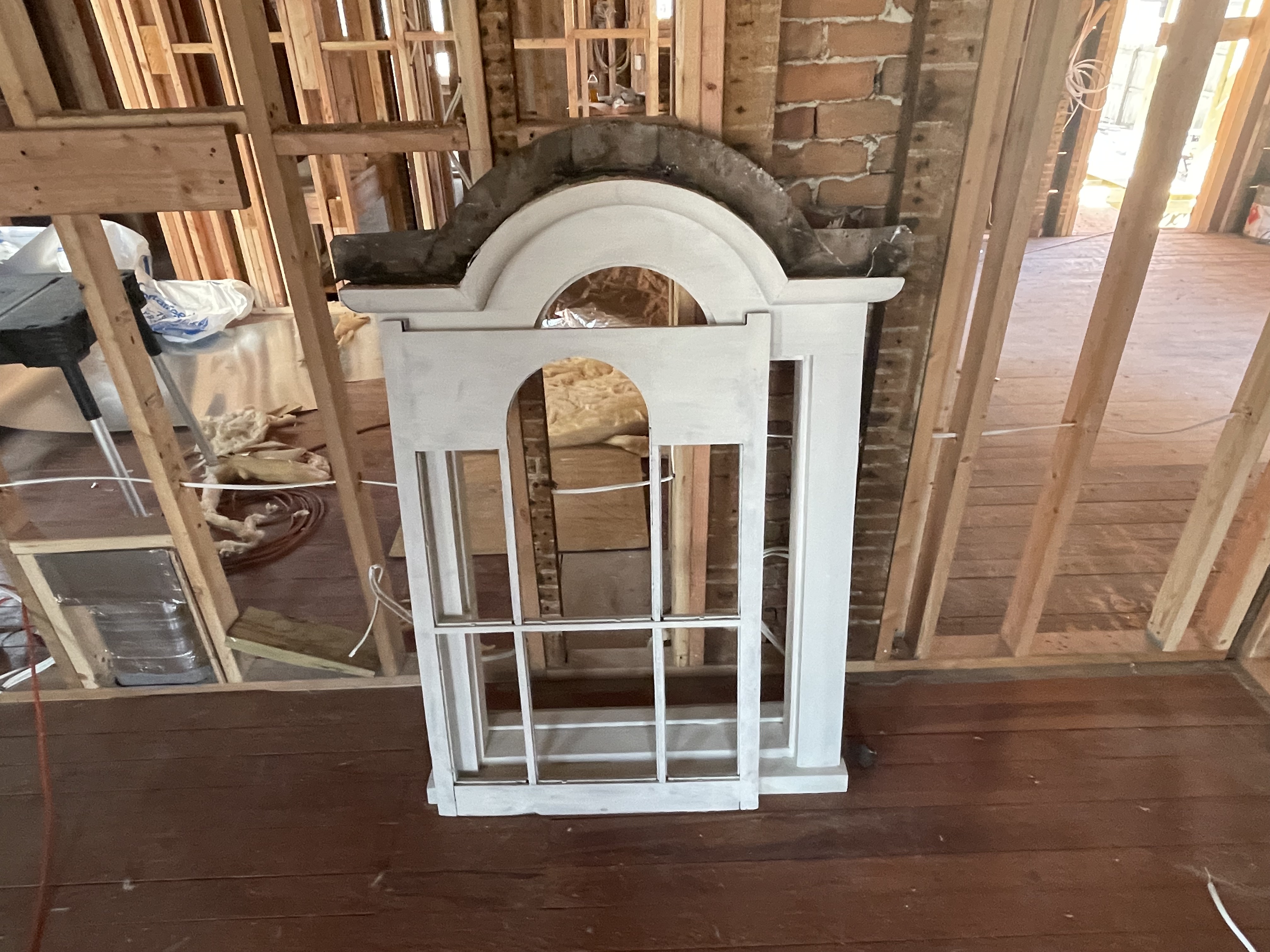 The front attic window. Now restored and waiting for colored glass along the sides. Clear in the middle.