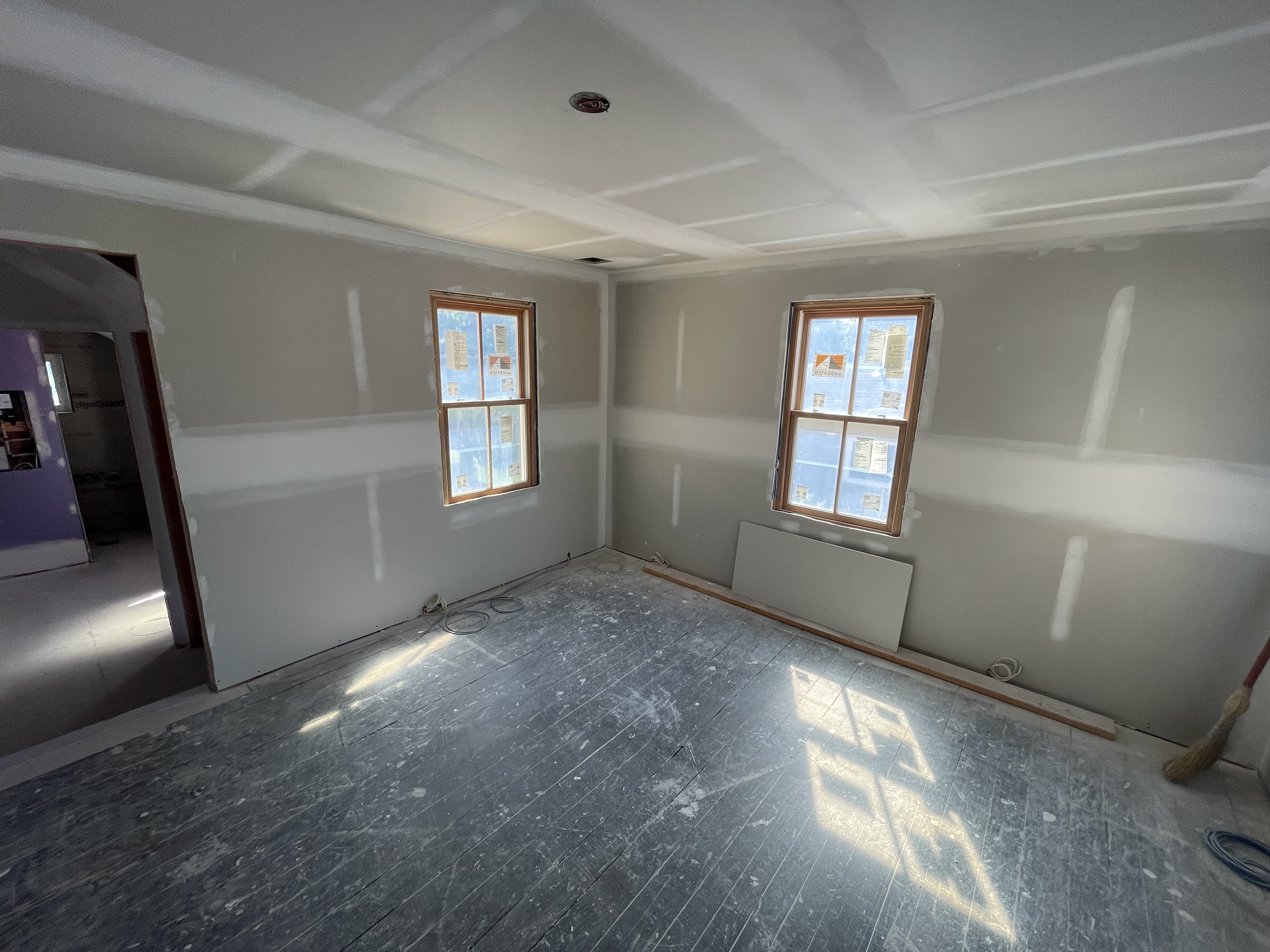 Upstairs guest bedroom. Doorway at left leads to small dressing area, then bath.