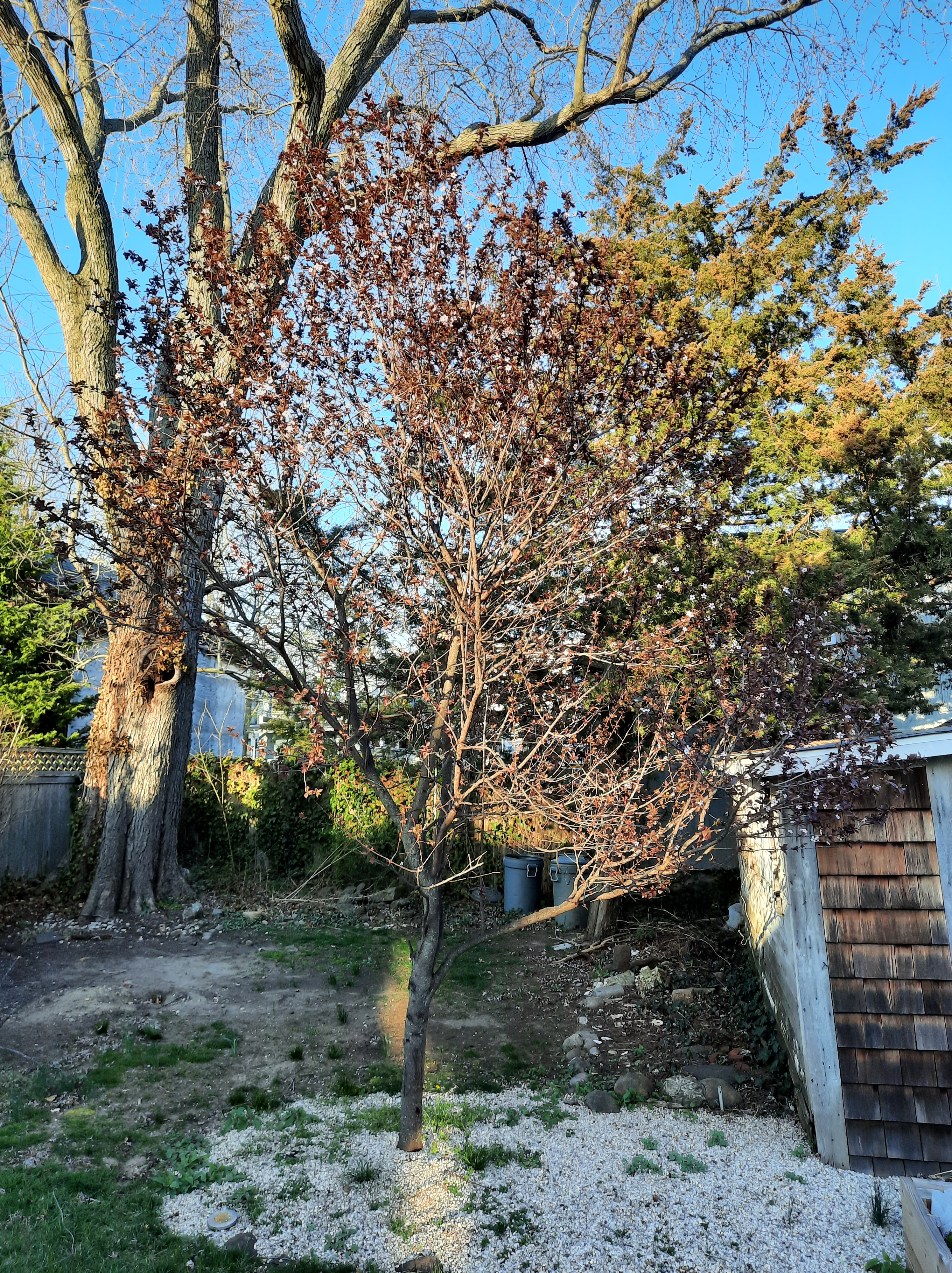 Flowering Plum. Will get too big for the spot. Will block all sun to that corner. REMOVED. Also gravel removed.