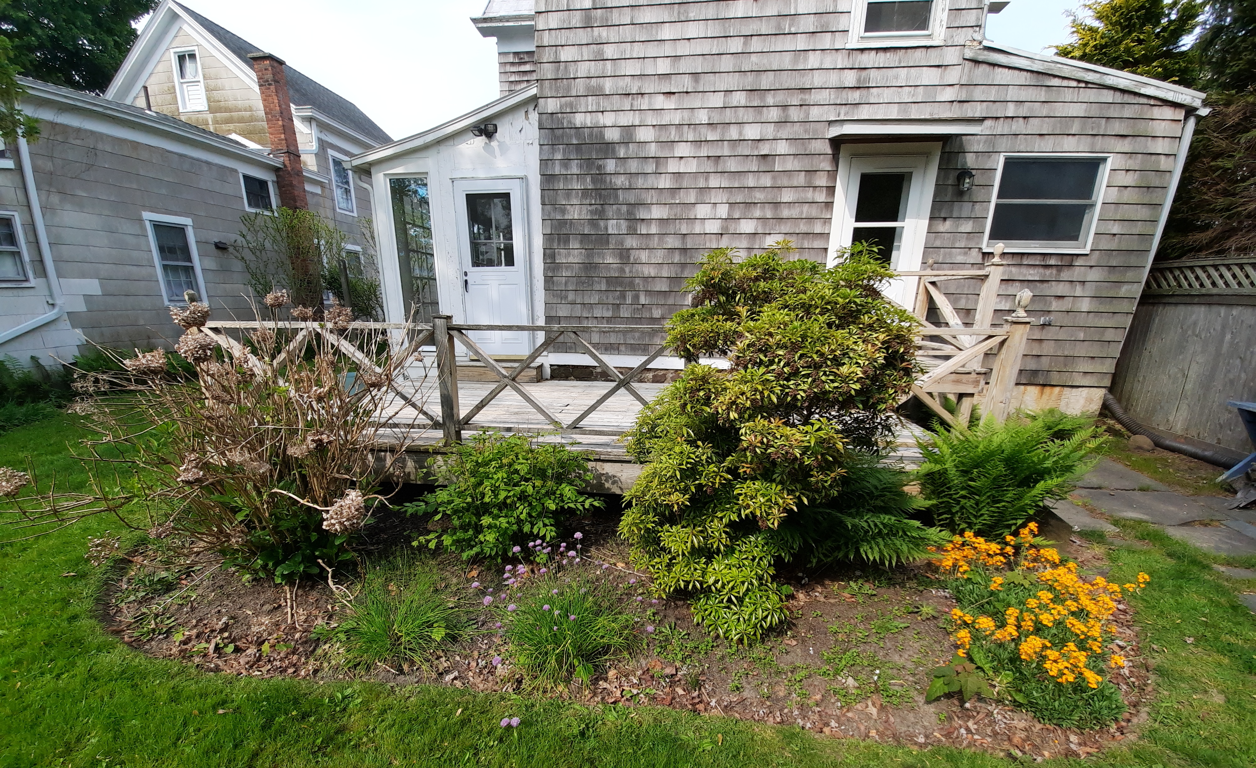 Deck bed: Hydrangea, ?, Mountain Laurel, fern, chives, Wallflower. ALL REMOVED. In its place will be a meadow garden.