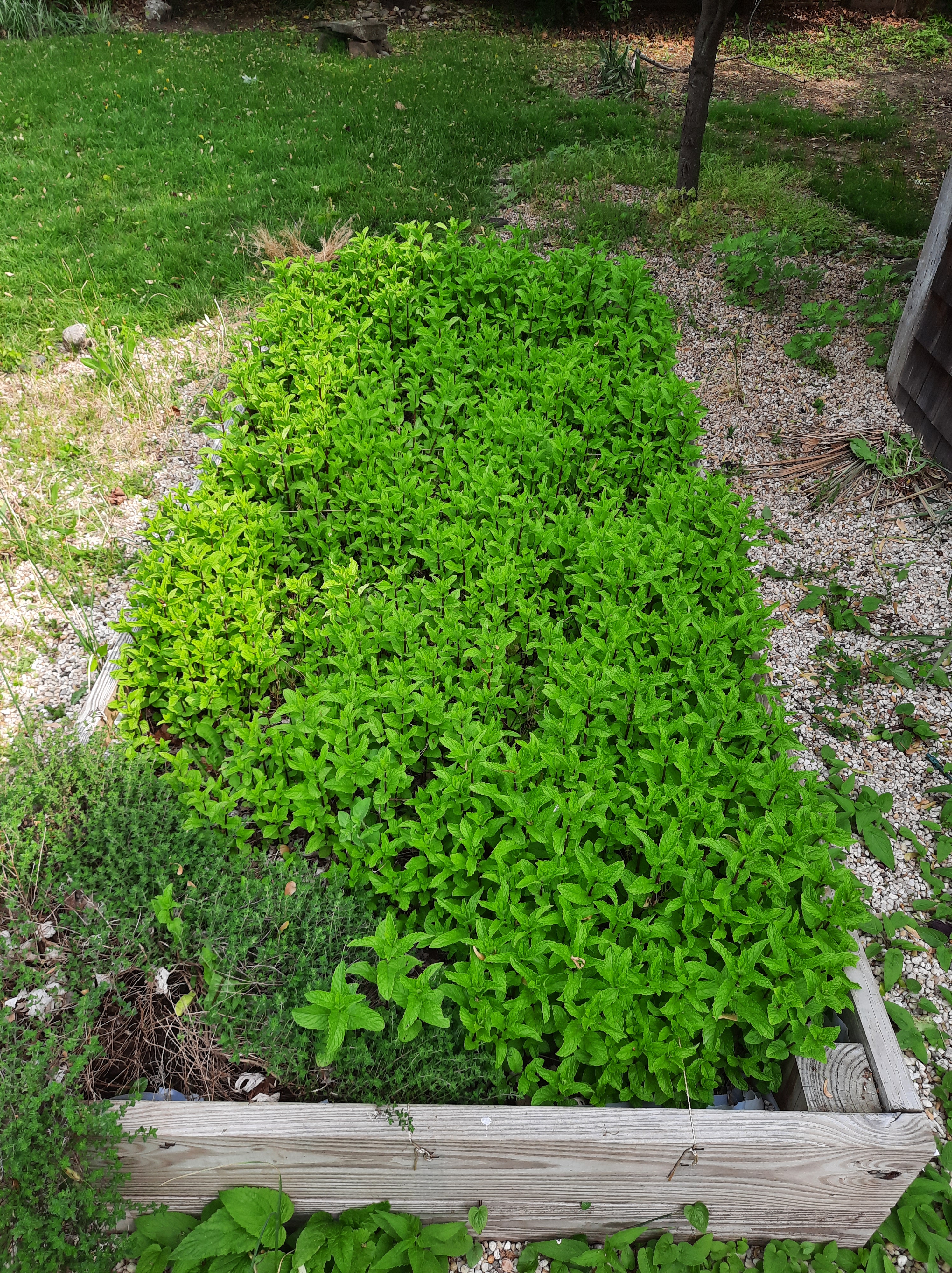 Raised bed of Spearmint with Thyme in corner. It is in the way of access to the bicycle part of the shed. Anyone can have some mint. Can soil be used elsewhere? REMOVE.