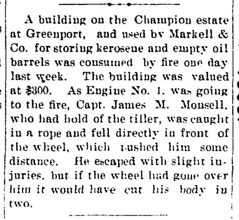 A Building on the Champion estate at Greenport, and used by Markell & Co. for storing kerosene and empty oil barrels was consumed by fire one day last week. The building was valued at $300. As Engine No. 1. was going to the fire, Capt. James M. Monsell, who had hold of the tiller, was caught in a rope and fell directly in front of the wheel, which pushed him some distance. He escaped with slight injuries, but if the wheel had gone over him it would have cut his body in two.