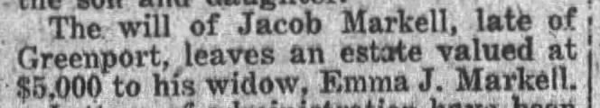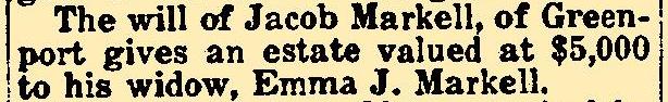 The will of Jacob Markell, of Greenport gives an estate valued at $5,000 to his widow, Emma J. Markell.