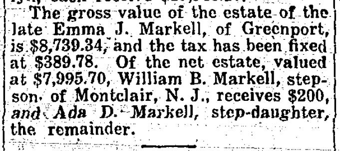 The gross value of the estate of the late Emma J. Markell, of Greenport, is $8,739.34, and the tax has been fixed at $389.78. Of the net estate, valued at $7,995.70, William B. Markell, stepson of Montclair, N.J., receives $200, and Ada D. Markell, step-daughter, the remainder.