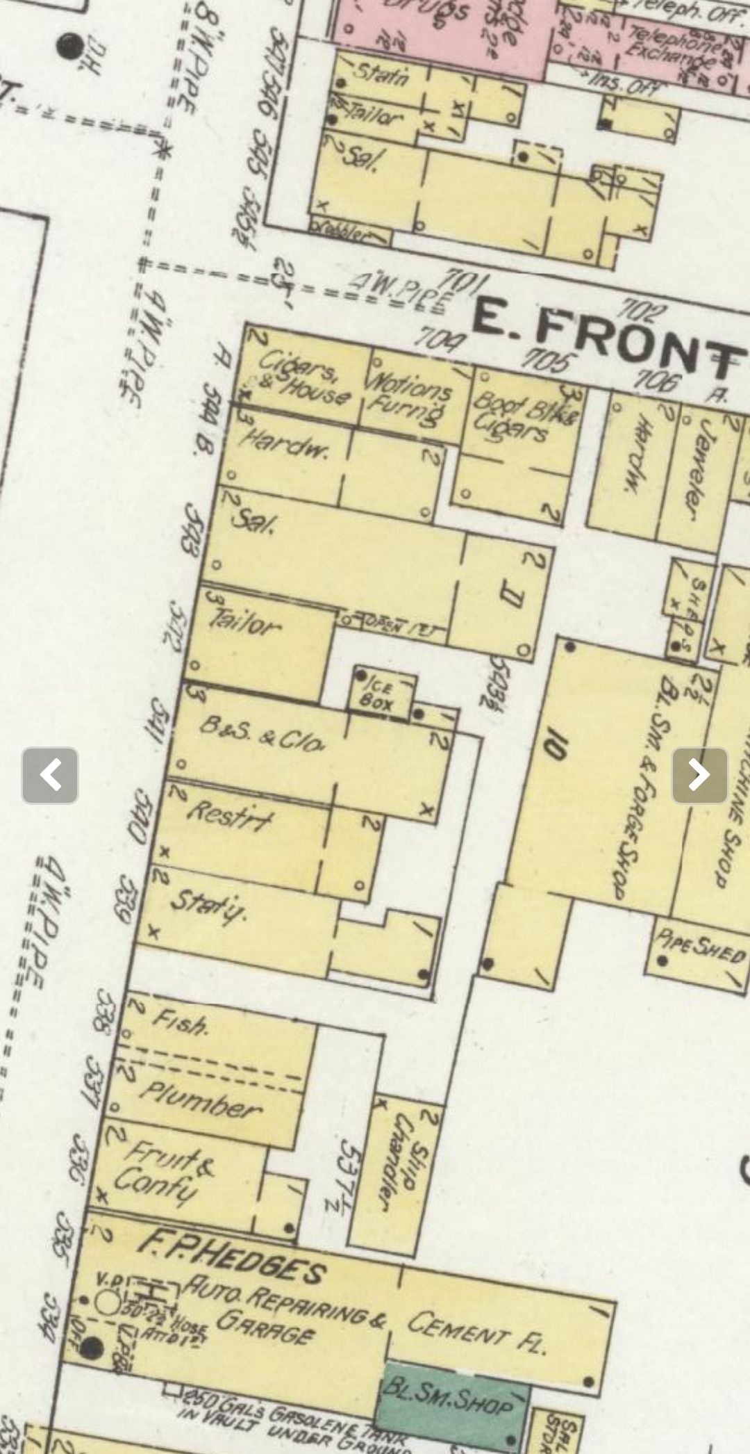An excerpt from the 1909 Sanborn map. The building labeled Hardw. is Jacob Markell Hardware.