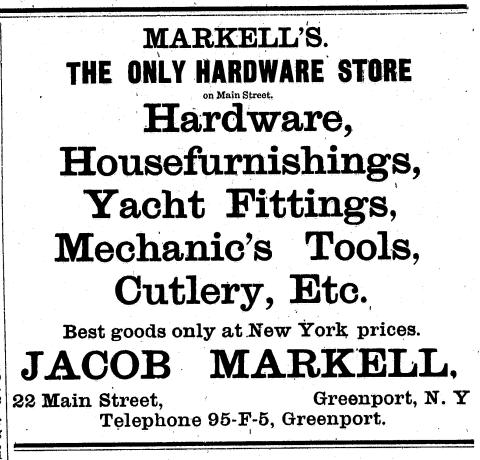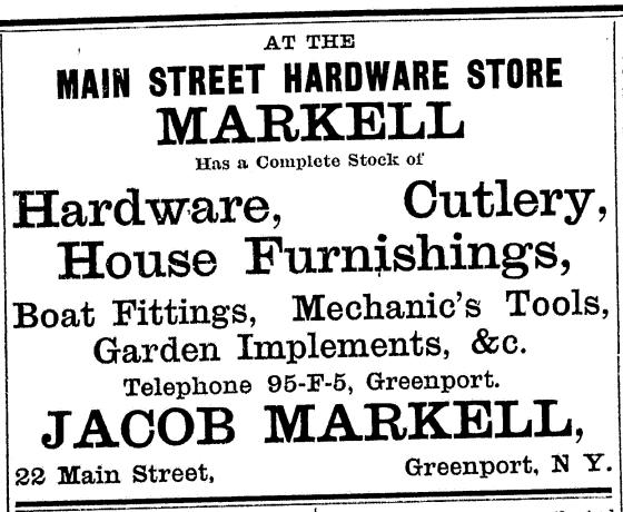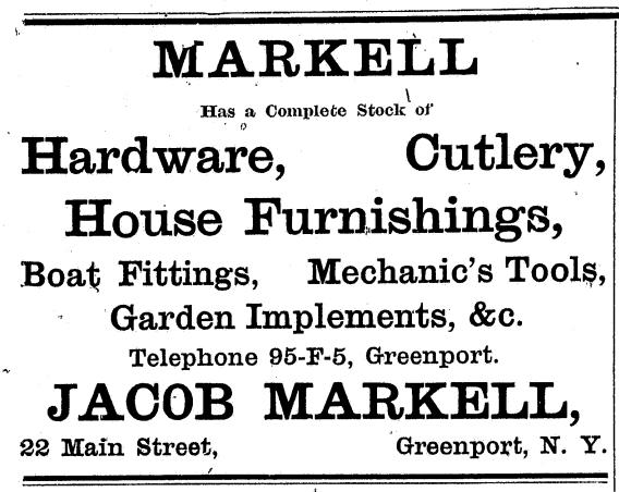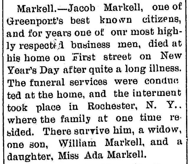 Markell.—Jacob Markell, one of Greenport's best known citizens, and for many years one of our most highest respected business men, died at his home on First street on New Years' Day after quite a long illness. The funeral services were conducted at the home, and interment took place in Rochester, N.Y., where the family at one time resided. There survive him, a widow, one son, William Markell, and a daughter, Miss Ada Markell.