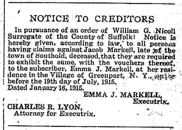 In pursuance of an order of William G. Nicoll Surrogate of the County of Suffolk: Notice is herby given, according to law, to all persons having claims against Jacob Markell, late of the town of Southold, deceased, that they are required to exhibit the same, with the vouchers thereof, to the subsciber, Emma J. Markell, at here residence in the Village of Greenport, N.Y., on or before the 19th day of July, 1915.