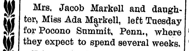 Mrs. Jacob Markell and daughter, Miss Ada Markell, left Tuesday for Pocono Summit, Penn., where they expect to spend several weeks.