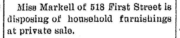 Miss Markell of 518 First street is disposing of household furnishings at private sale.