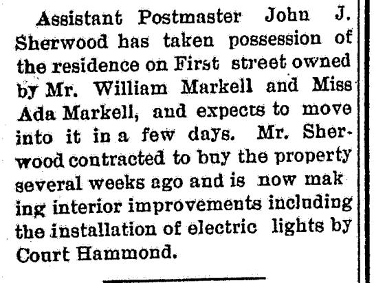 Assistant Postmaster John J. Sherwood has taken possession of the residence on First street owned by Mr. William Markell and Miss Ada Markell, and expects to move into it in a few days. Mr. Sherwood contracted to buy the property several weeks ago and is now making interior improvements including the installation of electric lights by Court Hammond.